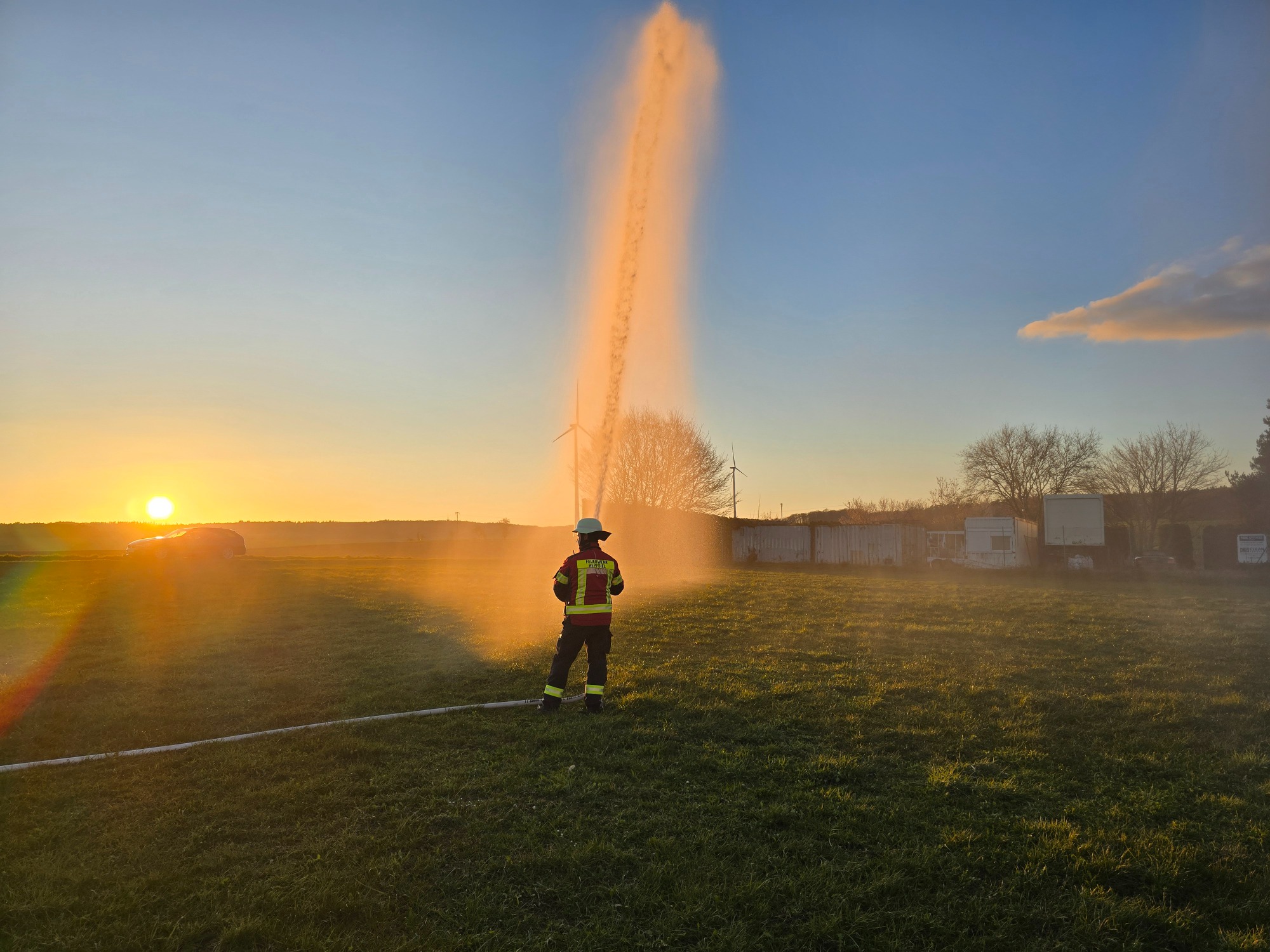 Wir haben die Wasserentnahme am Unterflur-Hydranten und einen kleinen Löschaufbau geübt. Dabei ist uns aufgefallen, dass der Wasserdruck im Ort bei nur 2bar liegt. Damit ist ein Löschen im Ernstfall nur sehr eingeschränkt möglich. Wir sind zu zwei weiteren Hydranten gefahren und haben leider den gleichen niedrigen Druck feststellen müssen. Aber dadurch konnten wir das gleich dem örtlichen Versorger melden.
